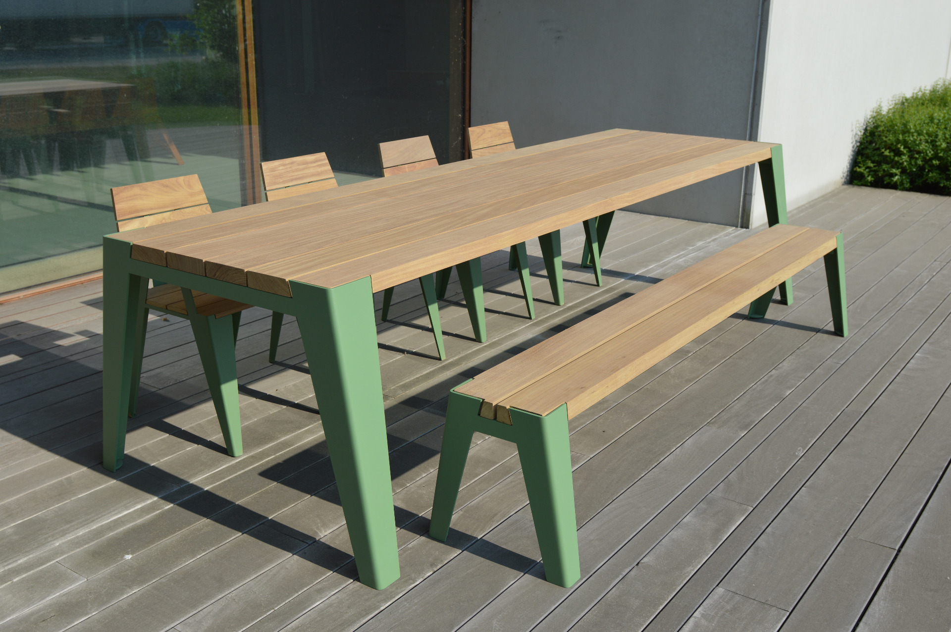 The Gordes bench consists of powder-coated alumininium and a wooden seat. Afrormosia wood (see photo) or thermo Frake is used for this. The table is lacquered in the RAL colour of your choice and can be obtained in the following lengths: 120 cm - 180 cm - 250 cm.