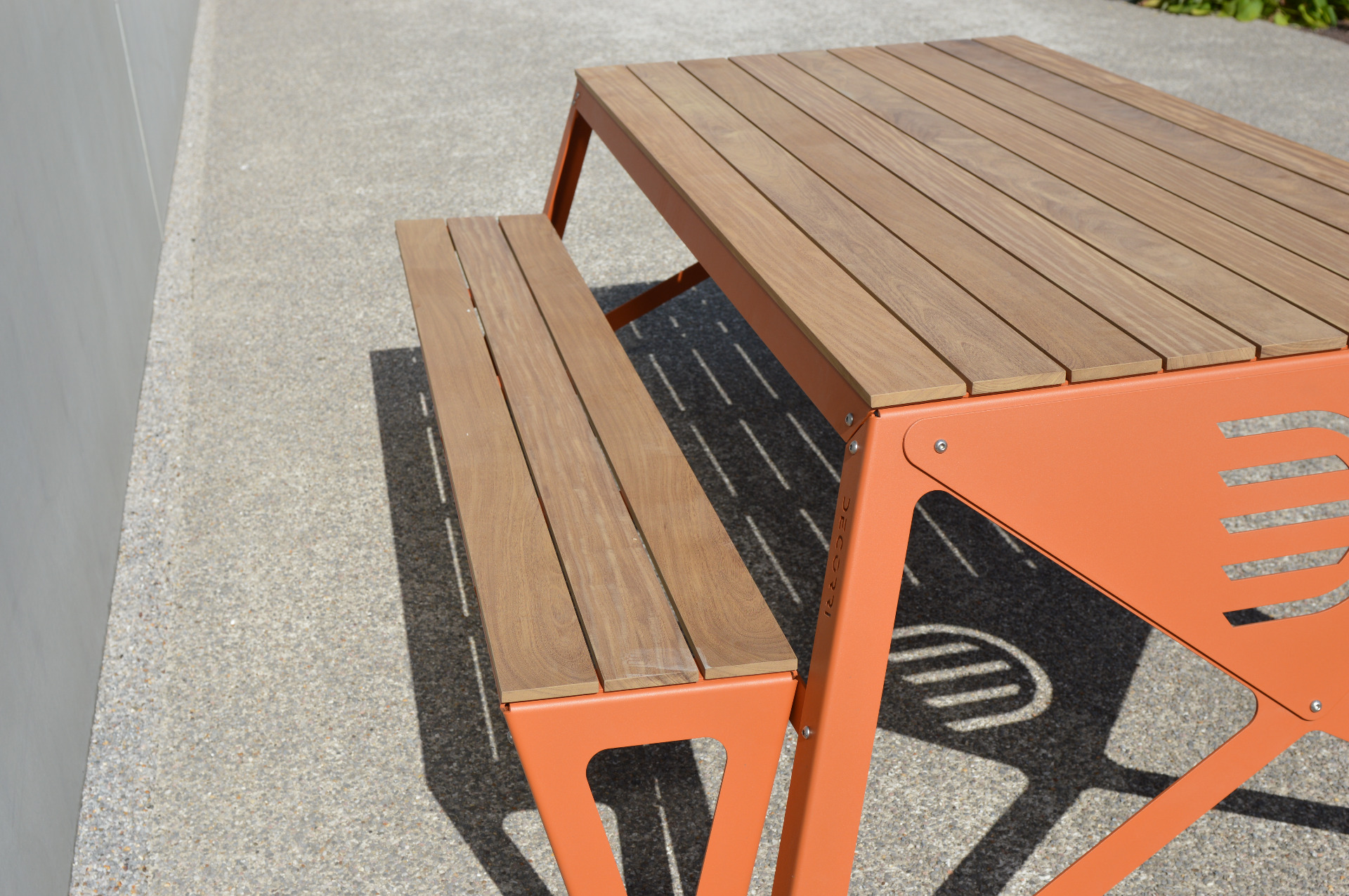 The Soller Fixed Bench is made in metallised and lacquered steel in a RAL colour of your choice. This bench is upholstered in Afrormosia wood (see photo) or thermo Frake.