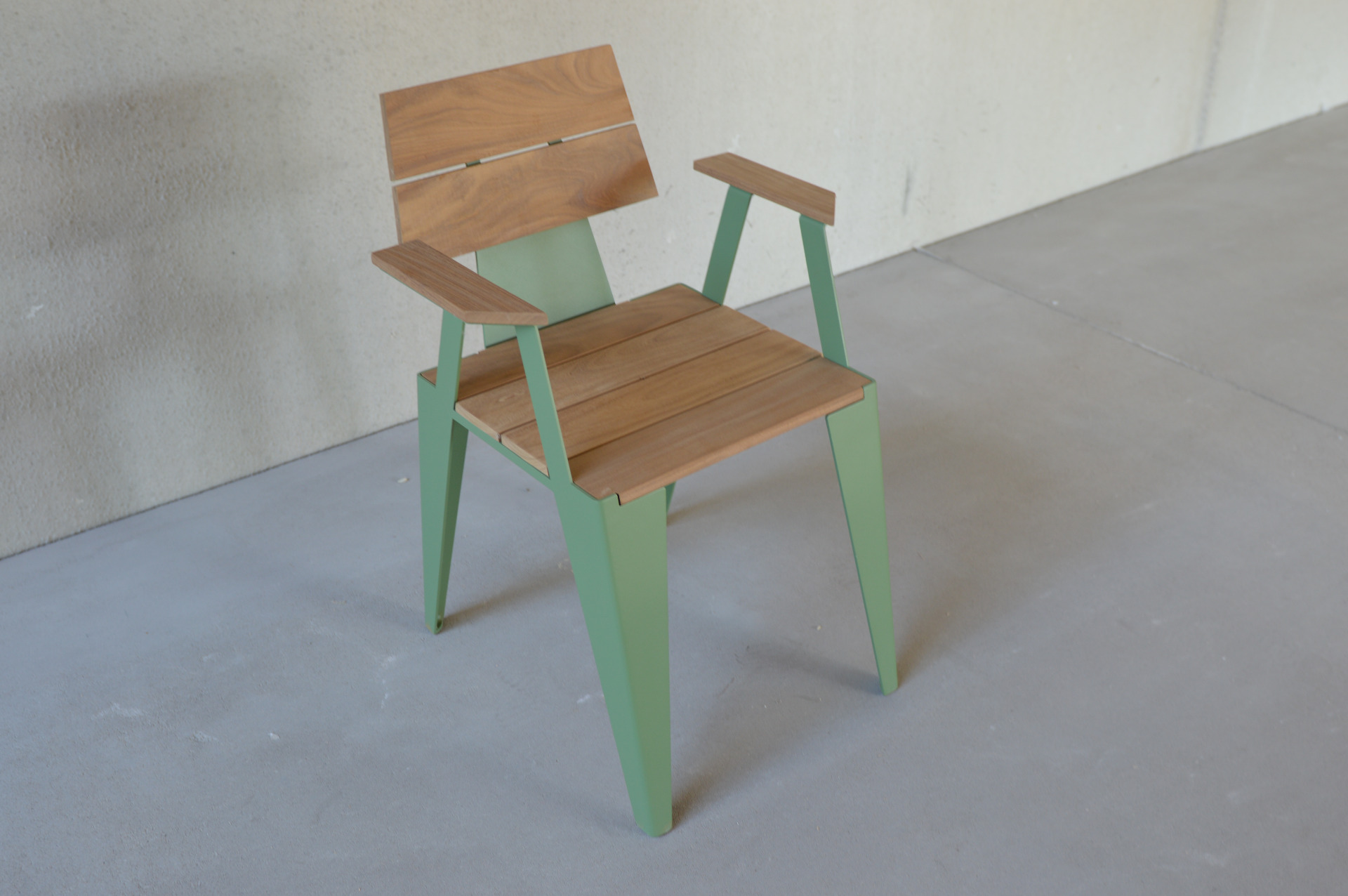The Gordes chair is made of powder-coated alumininium and a wooden seat. Afrormosia wood (see photo) or thermo Frake is used for this. This chair is lacquered in the RAL colour of your choice.